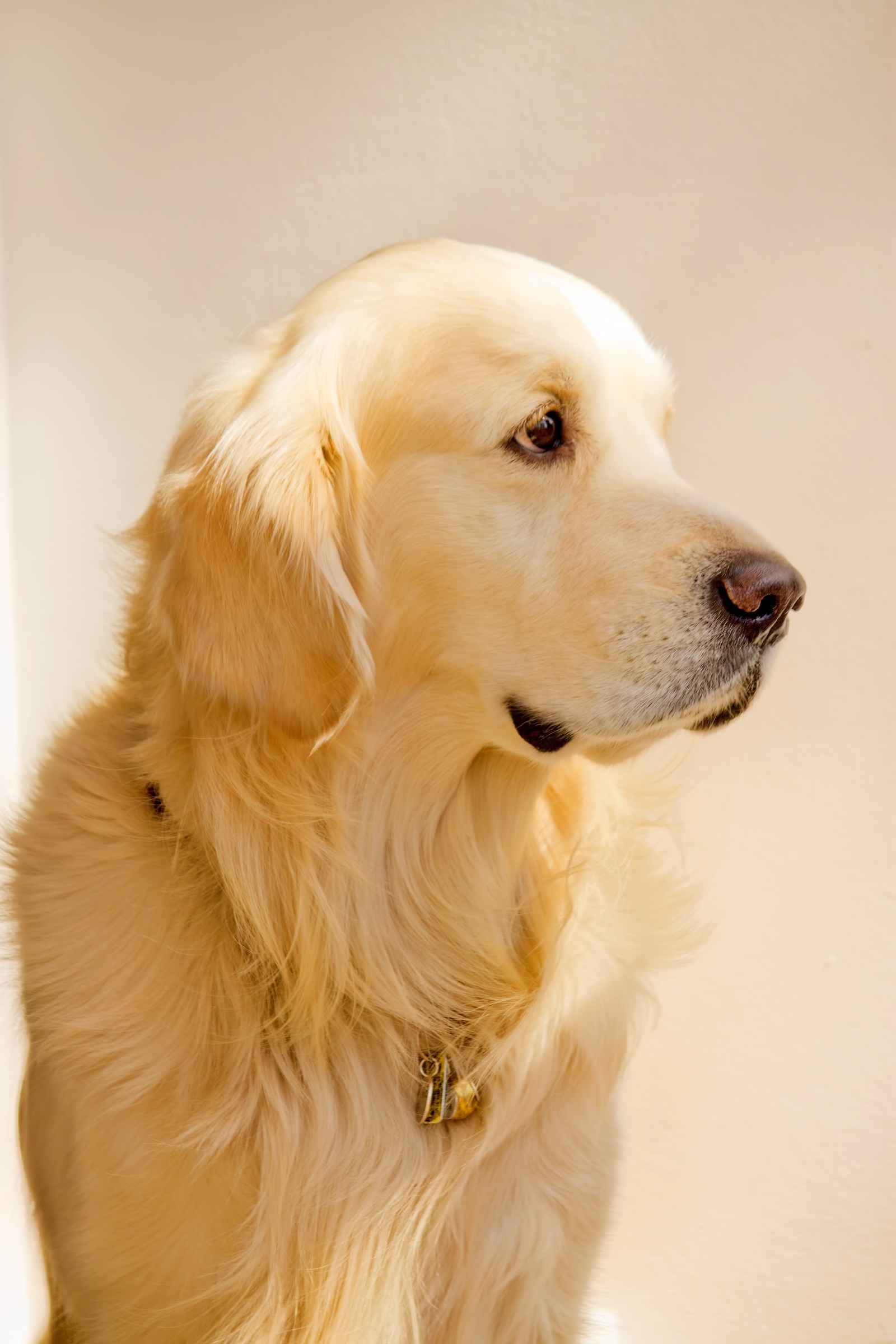日向に伏せて遠くを見つめるレトリバーの写真素材です。金色の毛並みの犬がリラックスした姿で横たわっています。|登録不要で無料|フリー素材ぱくたそ